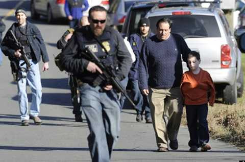 | Phụ huynh cùng con rời trường tiểu học Sandy Hook sau vụ xả súng hôm 14/12 |