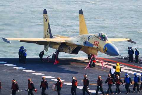 | Một chiếc J-15 đang được kiểm tra trước khi tham gia chương trình huấn luyện bay thử nghiệm |