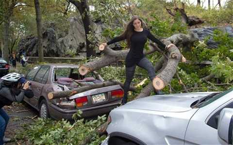 Trong những bức ảnh trên, Nana Gouvea, 30 tuổi, mặc bộ quần áo bó sát người, tạo dáng chuyên nghiệp trước cảnh cây đổ và xe hơi bị đè bẹp trên đường phố New York, sau khi siêu bão Sandy quét qua Bờ Đông Mỹ làm hơn 80 người thiệt mạng.