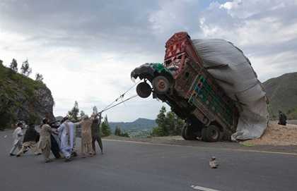 | Những người đàn ông dùng dây thừng cố "cứu" chiếc xe chở bột mì quá tải trên đường Dargai, quận Malakand cách thủ đô Pakistan 100 dặm về hướng đông bắc hôm 13/4. |