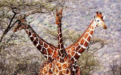 | Thoạt nhìn người ta tưởng đây là hình ảnh của một sinh vật 3 đầu mới xuất hiện. Thực chất, đó chỉ là khoảnh khắc chụp ngẫu nhiên 3 chú hươu cao cổ tại Công viên Bảo tồn Quốc gia Samnuru (Kenya) |
