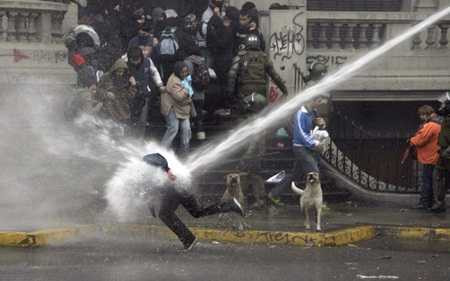 | Người biểu tình bị vòi rồng cảnh sát hất tung lên ở thủ đô Santiago, Chile |