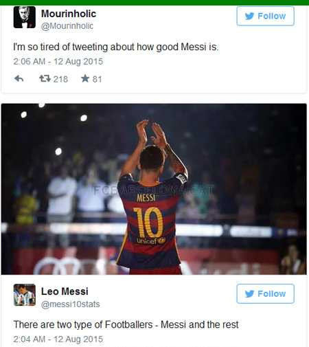Tài khoản Mourinholic thay vì nhắc đến án phạt nặng nề mà Mourinho dành cho bác sỹ Eva Caneiro lại tỏ ra mệt mỏi vì suốt ngày phải lên mạng để chia sẻ những điều quá đỗi tốt đẹp về Messi.