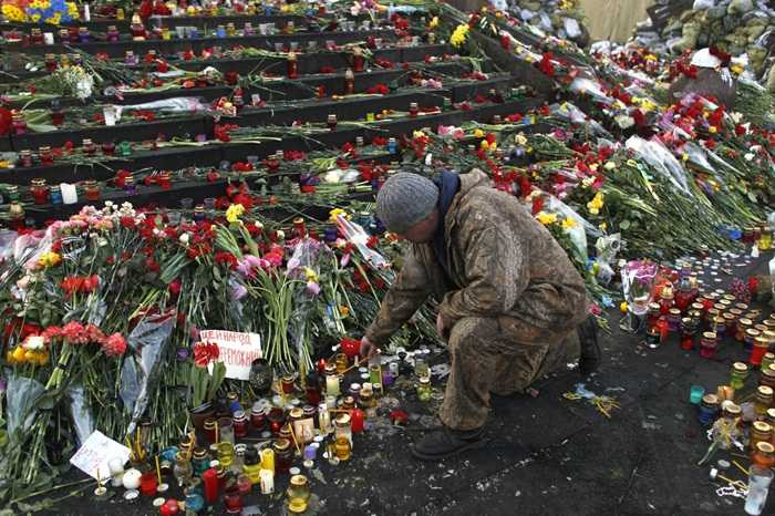 Người đàn ông thắp nến tưởng niệm các nạn nhân thiệt mạng trong bạo loạn Ukraine kéo dài từ tháng 11 năm ngoái đến nay