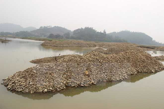 Bãi sỏi thải ở khu vực xã Vạn Thọ (huyện Đại Từ) làm cản trở dòng chảy và ảnh hưởng đến môi trường, cảnh quan du lịch Hồ Núi Cốc. (Ảnh minh họa. Nguồn: TTXVN)