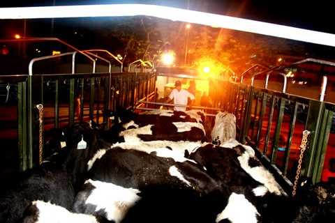 | Sau khi được đưa từ máy bay xuống, bò được chuyển sang các xe tải để vận chuyển về trang trại của Vinamilk ở Thanh Hóa |