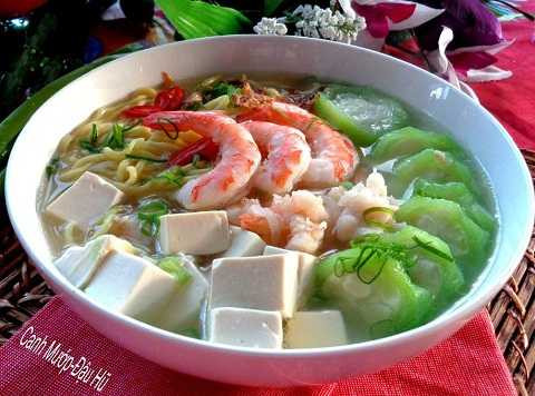 Khi nước canh sôi, bạn hớt bỏ bột, rồi cho mướp, đậu hũ, mì trứng, các gia vị còn lại vào nấu vài phút, nêm nếm lại vừa ăn là tắt bếp.