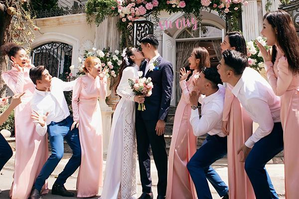 Dàn phù dâu, phù rể hỗ trợ Minh Hằng và ông xã đều là những gương mặt có tiếng của showbiz Việt như Khả Ngân, Khả Như, Annie Thu Thuỷ (nhóm LipB), Lương Mạnh Hải...