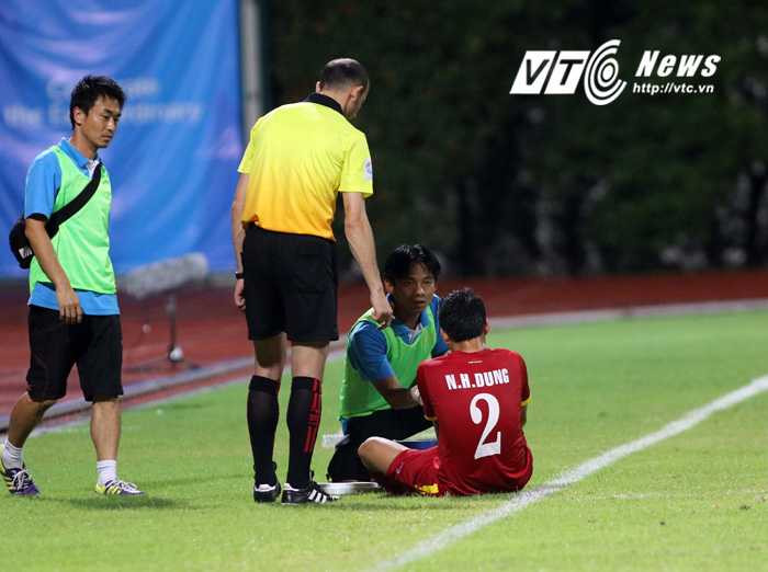 Sau khi được thay người, Hữu Dũng tỏ ra rất đau. Anh phải nhờ bác sĩ dìu vào phòng y tế để nghỉ ngơi với bước chân tập tễnh.