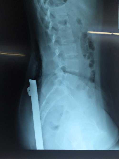 Kết quả chụp X-quang cho thấy, thanh sắt dài khoảng 40cm đâm từ phía sau, dưới mông xuyên đến tận thắt lưng. Tại đây, bệnh nhân nhanh chóng được làm các xét nghiệm, chụp chiếu cần thiết sau đó được chuyển thẳng tới phòng mổ.