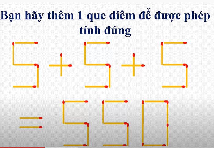 Mạng xã hội đang lan truyền hình ảnh về câu đố tưởng đơn giản nhưng làm khó rất nhiều người. Câu đố yêu cầu: Bạn hãy thêm một que diêm để được phép tính đúng là 5+5+5=550.