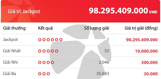 Theo xác định của đơn vị phát hành, tấm vé trúng giải có dãy số 02-03-16-19-22-34. Sau khi thực hiện nghĩa vụ thuế thu nhập cá nhân 10%, người chơi may mắn sẽ nhận về khoản thực lĩnh khoảng hơn 88 tỷ đồng thông qua hình thức chuyển khoản một lần.