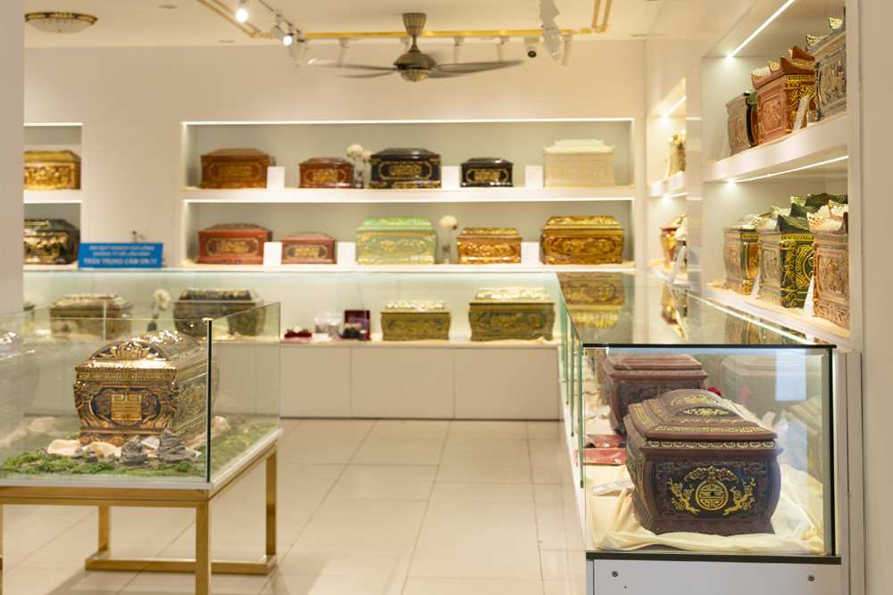 Nhiều mẫu quách đắt tiền được bày tại công ty.