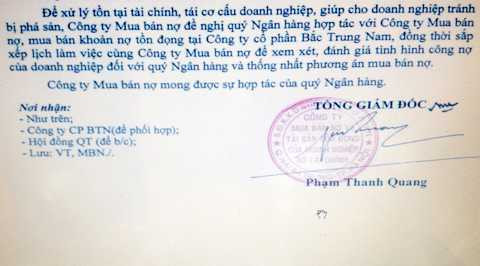 Ngày 9/8, bà Đỗ Thị Hồng, Giám đốc Công ty cổ phần Bắc Trung Nam (Thanh Hóa) cho biết, đã nhận được công văn của Công ty Mua bán nợ và Tài sản tồn đọng của doanh nghiệp (Bộ Tài chính) về việc muốn tham gia thu xếp nợ cho đơn vị. Công văn do Tổng giám đốc DATC Phạm Thanh Quang ký ngày 8/8 và cùng gửi đến 3 ngân hàng chủ nợ lớn nhất của Bắc Trung Nam.