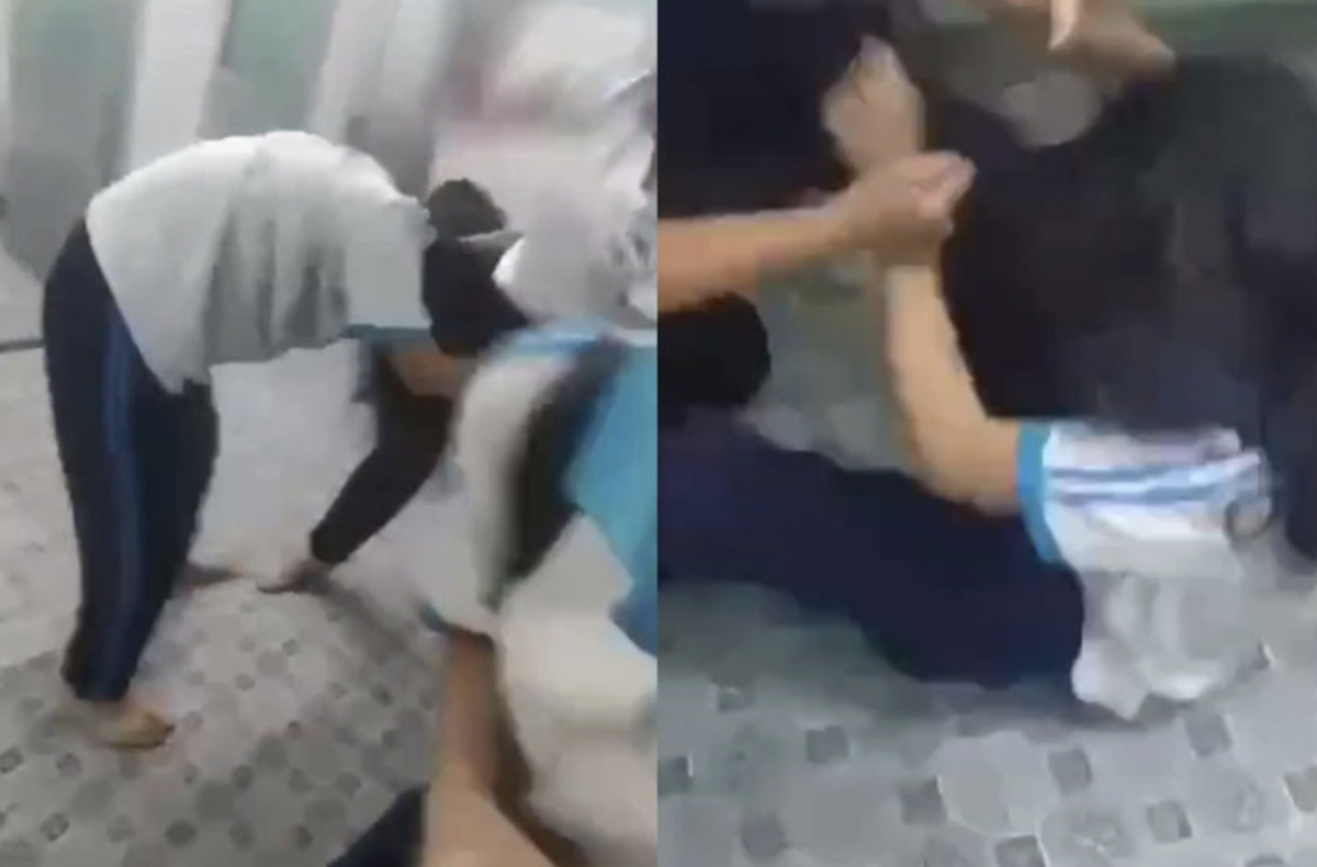 Hai nữ sinh túm tóc nhau, quăng quật xuống sàn nhà vệ sinh. Một nữ sinh nhìn to lớn hơn đã ngồi lên người nữ sinh còn lại và liên tục tát vào mặt đối phương. Sự việc kéo dài trong khoảng 3 phút.