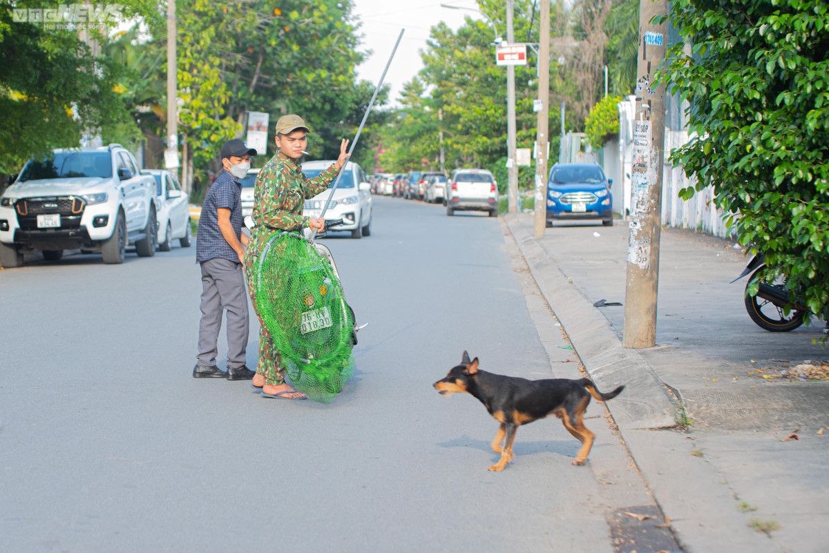 Trên đường số 17, nhiều chú chó chạy ra đường, ngay lập tức những thành viên trong đội săn bắt liền vung vợt tóm gọn.