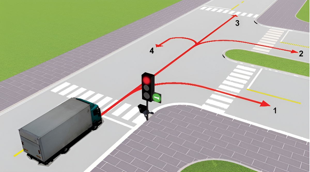 Theo tín hiệu đèn, xe tải đi theo hướng nào là đúng quy tắc giao thông?