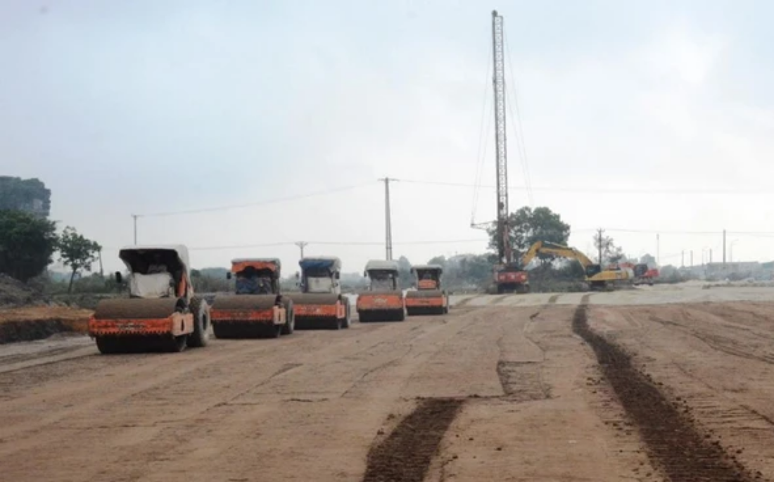 Nhà thầu thi công cát đắp nền đường dự án cao tốc Bắc-Nam. (Ảnh: Việt Hùng/Vietnam+)