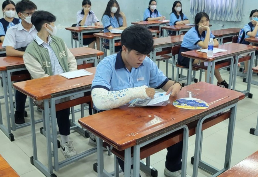 Chiều 5/6, trả lời VTC News, ông Hồ Tấn Minh, Chánh Văn phòng Sở GD-ĐT TP.HCM cho biết, trong kỳ tuyển sinh lớp 10 năm hoc 2023 - 2024, có 9 thí sinh phải nhờ cán bộ coi thi hỗ trợ, trong đó có 8 thí sinh bị gãy tay và 1 thí sinh khiếm thính được mang máy trợ thính.