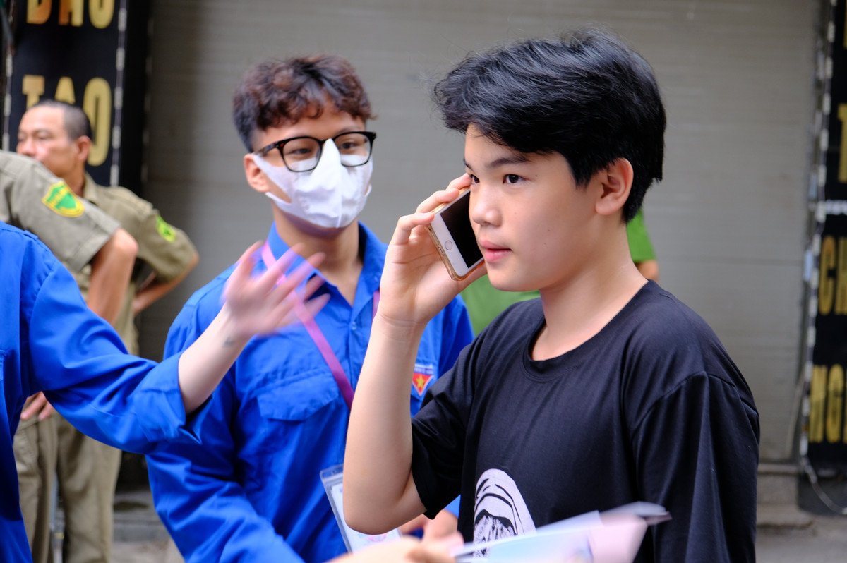 7h10, sắp đến giờ vào phòng thi, một em học sinh hốt hoảng vì quên giấy tờ cá nhân. Ngay sau đó, đội tình nguyện viên đã hỗ trợ giúp em gọi điện 'cầu cứu' người thân. Hình ảnh ghi nhận tại điểm thi THPT Khương Đình (quận Thanh Xuân).