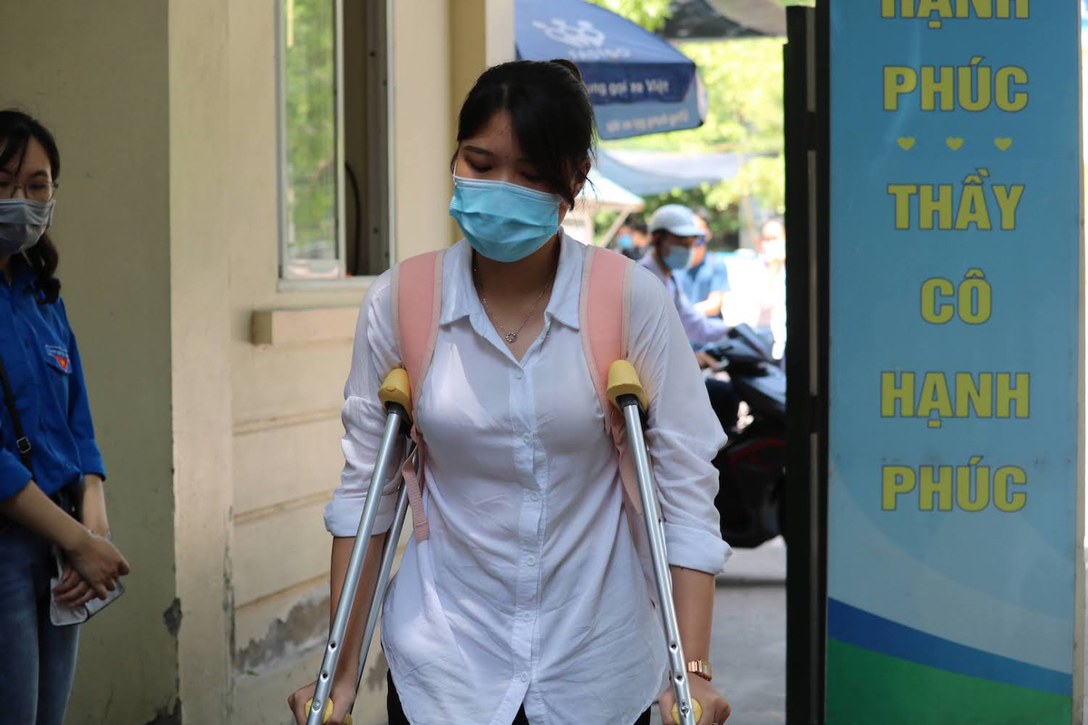 Chiều 10/8, các thí sinh sẽ hoàn thành bài thi Ngoại ngữ theo hình thức trắc nghiệm trong thời gian 90 phút. Ghi nhận tại điểm trường THPT Phan Huy Chú (Đống Đa, Hà Nội) các thí sinh tới trường từ rất sớm. Trong đó có thí sinh không may mắn bị gãy chân phải chống nạng đi thi. Thí sinh được đội thanh niên tình nguyện hỗ trợ cầm đồ và đưa vào phòng thi.