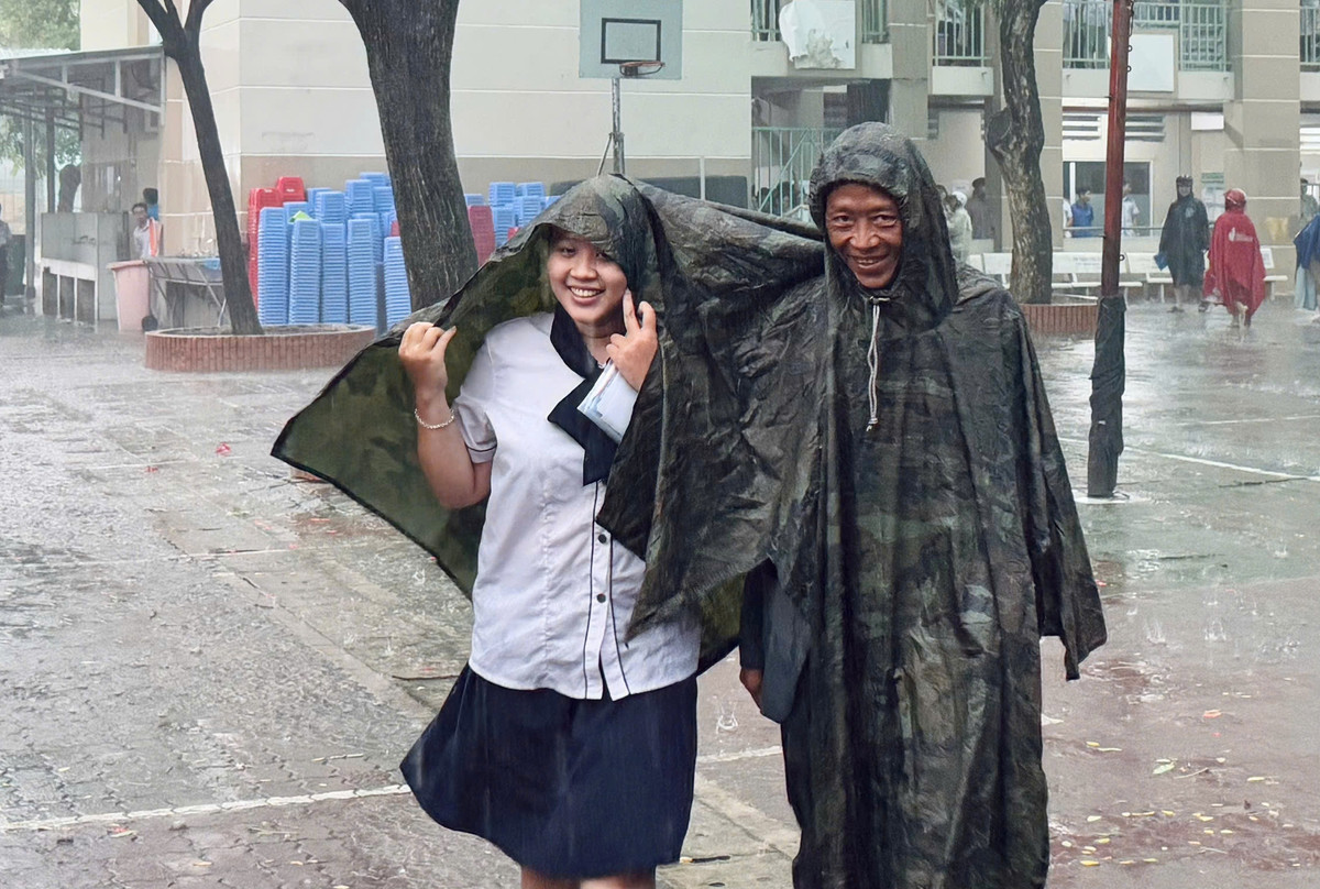 Ông Hoàng Văn Phúc (ngụ TP Thủ Đức) chia sẻ: "Dù trời mưa lớn nhưng tôi vẫn cố đứng gần cổng để con có thể thấy mình ngay khi ra khỏi phòng thi. Hôm nay, cha mẹ đến đây không phải để mong con đạt điểm cao mà chỉ muốn tiếp thêm tinh thần và đồng hành cùng con trong chặng đường này".