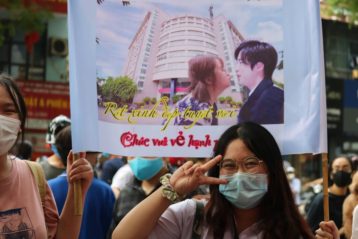 Chiều 9/8, tại điểm thi trường THPT Việt Đức (Hà Nội), một nhóm bạn trẻ đang căng băng rôn có nội dung: "Họ Đỗ thì không thể trượt được. Rất xinh đẹp tuyệt vời. Chúc vui vẻ hạnh phúc bình an" để chào đón cô bạn thân thi tại điểm trường.