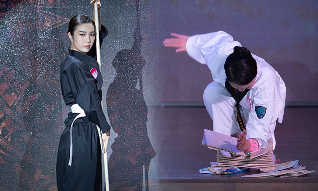 Đáng chú ý, người đẹp còn khiến giám khảo và các thí sinh bất ngờ khi dùng tay không chặt vỡ chồng gỗ.