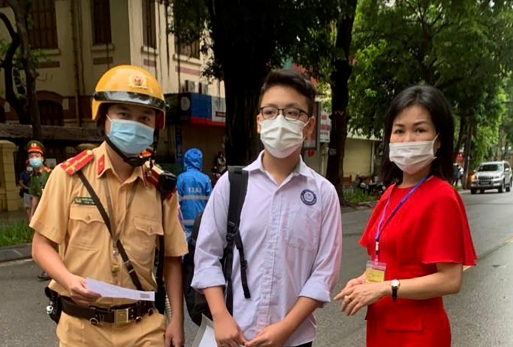 Thí sinh Nguyễn Hoàng Nhật Nam (học sinh trường THCS Đại Kim) cũng phải nhờ đến sự hỗ trợ từ lực lượng cảnh sát 113 quận Thanh Xuân đến được điểm thi trường THCS Khương Đình (Thanh Xuân, Hà Nội) đúng giờ.