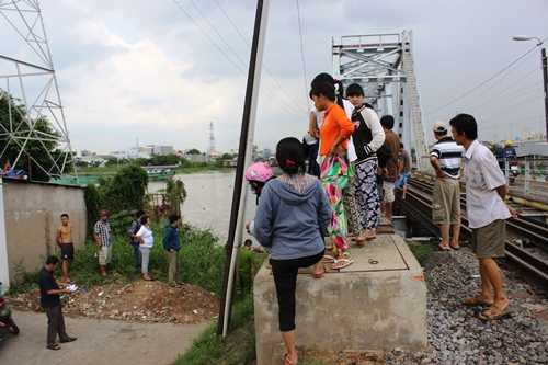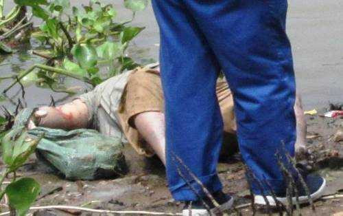Trên tay phải của thi thể nạn nhân còn bị cột vào một một bao tải màu xanh, bên trong chứa đá. Tại hiện trường rất đông người dân có mặt để dõi theo vụ việc.