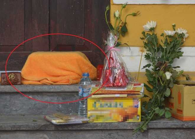 | Hài nhi xấu số được đặt trước cổng chùa. |