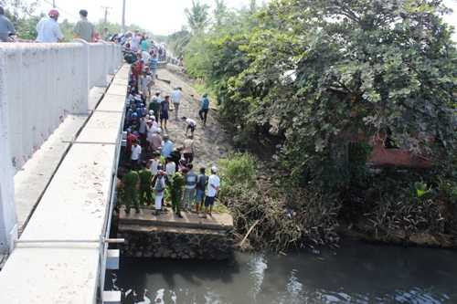 | Người dân hiếu kỳ vây kín khu vực cầu Gò Công để xem công an xử lý xác chết |
