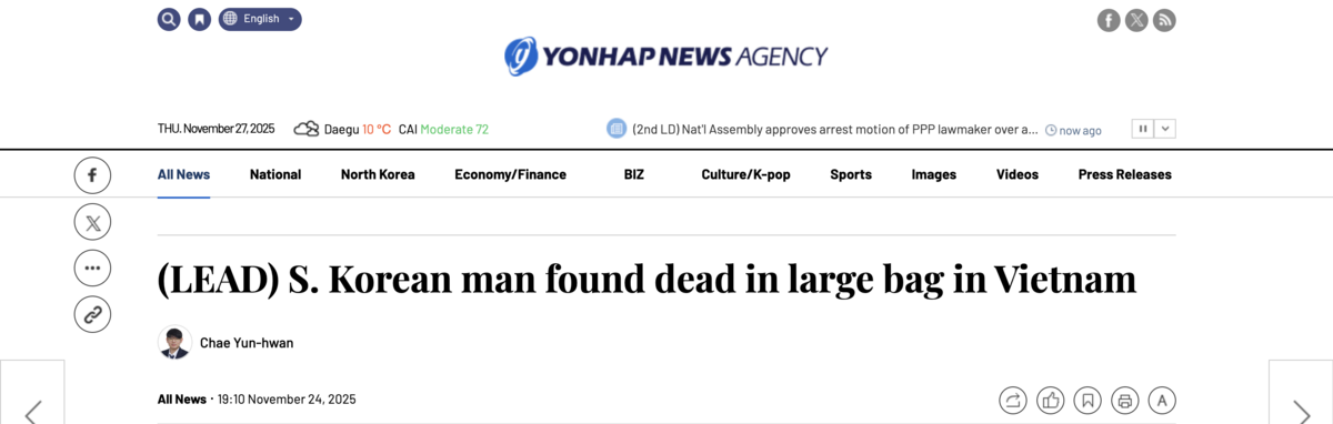 Ảnh chụp màn hình hãng tin Yonhap (Hàn Quốc) đưa tin người đàn ông được phát hiện tử vong trong một chiếc túi lớn tại khu dân cư ở TP.HCM được xác định là công dân Hàn Quốc.