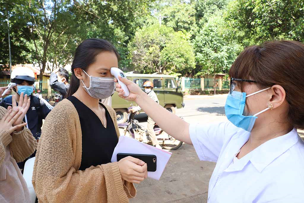 Chiều 2/9, các thí sinh ở Đắk Lắk đã hoàn thành thủ tục đăng ký dự thi và nghe quy chế thi tốt nghiệp THPT 2020. Hàng chục tình nguyện viên và nhân viên y tế thực hiện đo thân nhiệt, phát khẩu trang cho các thí sinh.