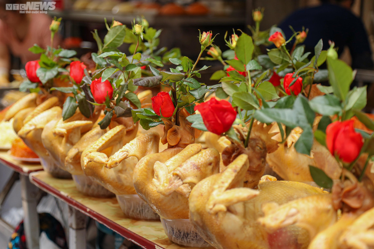 Tại chợ Hàng Bè, món gà cúng ngậm hoa hồng rất hút khách dù giá rất đắt, dao động 350.000 - 400.000 đồng/kg. Như vậy, tính ra, mỗi con gà cúng giá trung bình khoảng 500.000 - 700.000 đồng/con.
