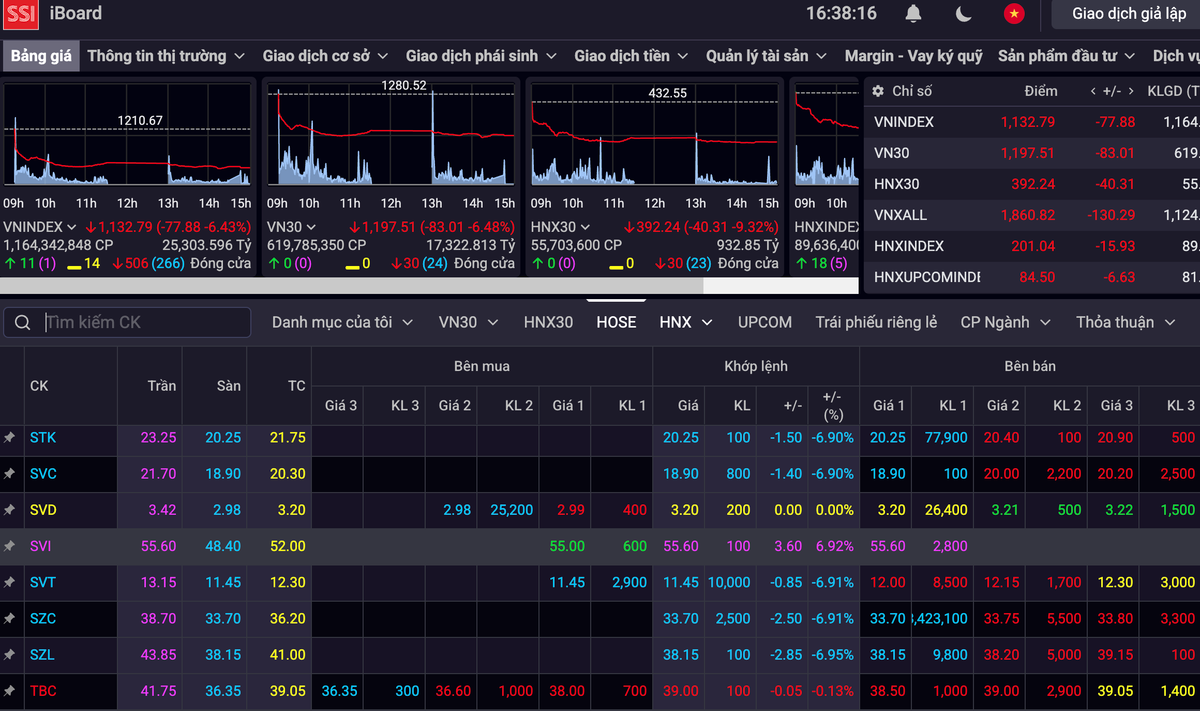 VN-Index kết phiên 8/4 lại mất thêm 77,88 điểm (-6,43%), qua đó rơi xuống mức 1.132,79 điểm, thấp nhất 15 tháng, kể từ đầu tháng 1/2024. Như vậy, chỉ sau 3 phiên, chỉ số chính của chứng khoán Việt Nam đã giảm 185 điểm, vốn hóa theo đó giảm gần 1,1 triệu tỷ đồng, còn khoảng 6,2 triệu tỷ đồng. Chỉ số hợp đồng tương lai VN30 tháng gần nhất (VN30F1M) cũng giảm kịch sàn.
