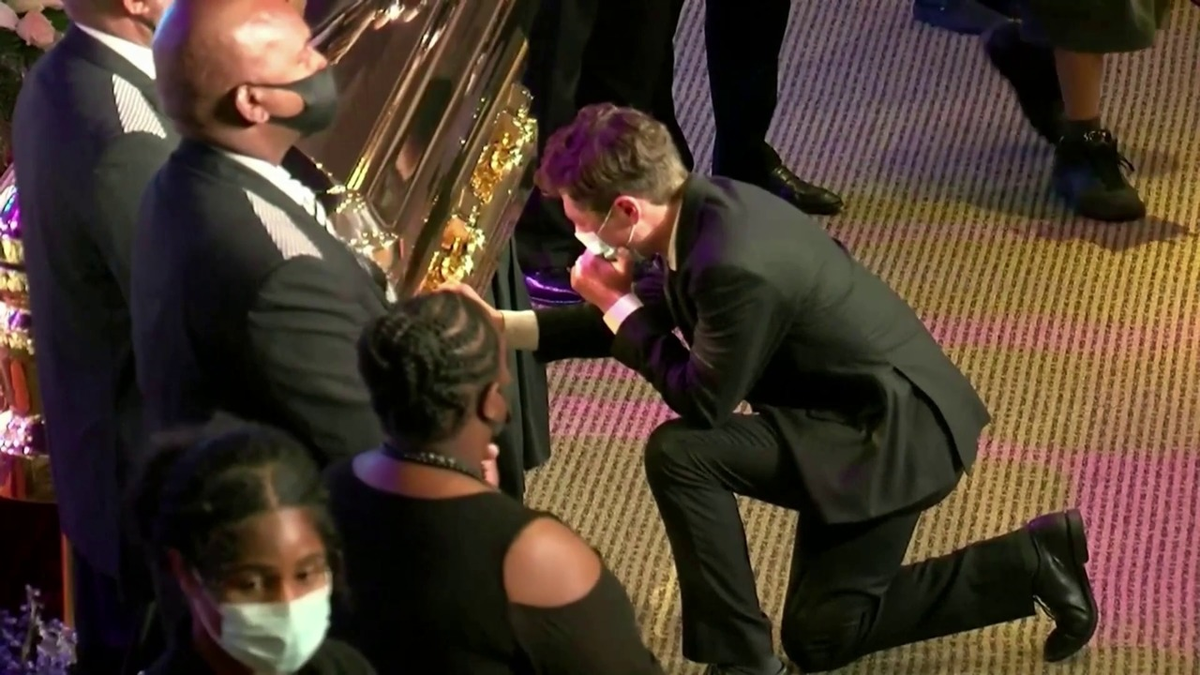 Khoảnh khắc xúc động của Thị trưởng Jacob Frey diễn ra vài phút trước tang lễ của George Floyd. Tại buổi lễ, nhà hoạt động Al Sharpton đọc điếu văn và kêu gọi người da màu hãy yêu cầu cảnh sát "bỏ đầu gối của các anh ra khỏi gáy chúng tôi".