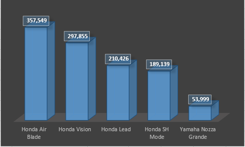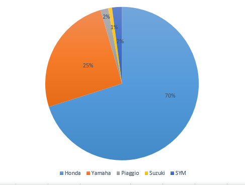 Trong 5 hãng xe lớn (Honda, Yamaha, Piaggio, SYM và Suzuki), Honda vẫn là thương hiệu thống trị thị trường Việt Nam với hơn 70% thị phần. Tại hầu hết các phân khúc, những mẫu xe của hãng này đều chiếm ưu thế về doanh số. Thực tế, trong 5 sản phẩm xe tay ga bán chạy nhất thị trường năm 2015 thì có 4 sản phẩm do Honda sản xuất. Tương tự, 3/5 mẫu xe số đắt khách nhất là đại diện của Honda.