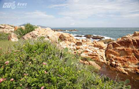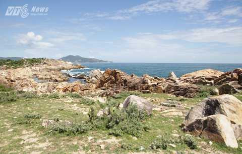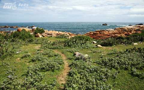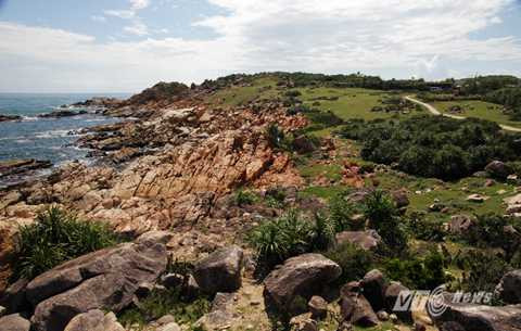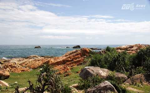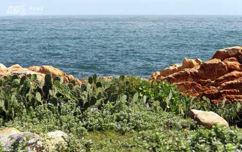 | Vẻ hoang sơ với màu xanh của cỏ cây, màu vàng đỏ của đá bazan và màu xanh của biển trời tạo nên một bức tranh đầy màu sắc ở Ghềnh Đèn. |