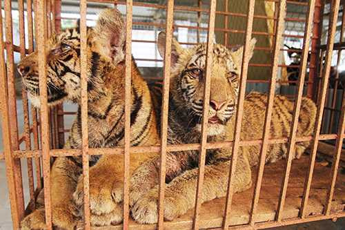 Cả nhóm nhà báo co rúm lại. Chả ai kịp hú hét, kể cả mấy chị đang buôn như pháo nổ. Ông làm một vòng quanh phòng rồi lại... lững thững ra. Sau mới biết, con hổ này được bắt từ hồi còn bé tí, được nuôi như nuôi chó và... hiền như mèo. Nó được dạy cho ăn cơm như... chó, thi thoảng mới có thịt, mà là thịt chín. Còn hồi mới bắt về, nó được nuôi bằng nước cơm và sữa đậu nành. Hồi tôi thấy, nó to bằng chừng con bê con, nhưng mà béo mẫm.