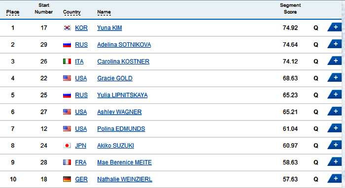 Dẫn đầu nội dung này đang là nữ hoàng trượt băng người Hàn Quốc, Yuna Kim với số điểm 74.92.