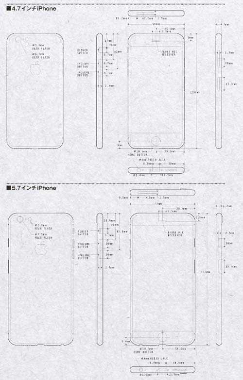 Trong sơ đồ thiết kế đến từ trung tâm Apple Mac Otakara của Nhật Bản. Mẫu iPhone mới (iPhone 6) phiên bản có màn hình 4.7 inch sẽ có kích thước 137 x 66 x 7 mm (iPhone 5S có kích thước 123.8 x 58.6 x 7.6 mm). Trong khi phiên bản lớn hơn có màn hình 5.7 inch với kích thước 157 x 77 x 6.7 mm, màn hình này giúp nó sánh ngang với Galaxy Note 3, nhưng hẹp và mỏng hơn nhiều.