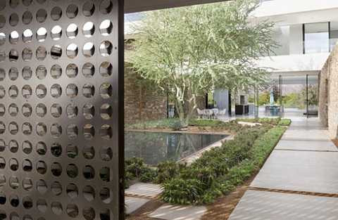 | Ngôi nhà có giếng trời là khu vực nhà vườn với hồ nước, cây xanh. Điều này rất hữu hiệu trong việc làm mát không gian. |