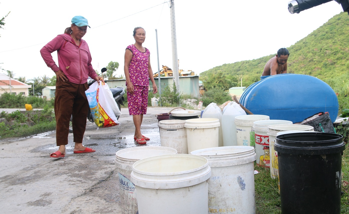 4 ngày trở lại đây, giờ giấc sinh hoạt và làm việc của bà Lê Thị Nhứt (thôn Bãi Ông, xã đảo Tân Hiệp) bị đảo lộn bởi gia đình đang đối mặt với tình trạng thiếu nước. 3h, bà Nhứt phải thức giấc và mang 14 chiếc thùng (loại 30 lít) vượt quãng đường tầm 3 cây số từ nhà lên gần khe để hứng nước suối.
