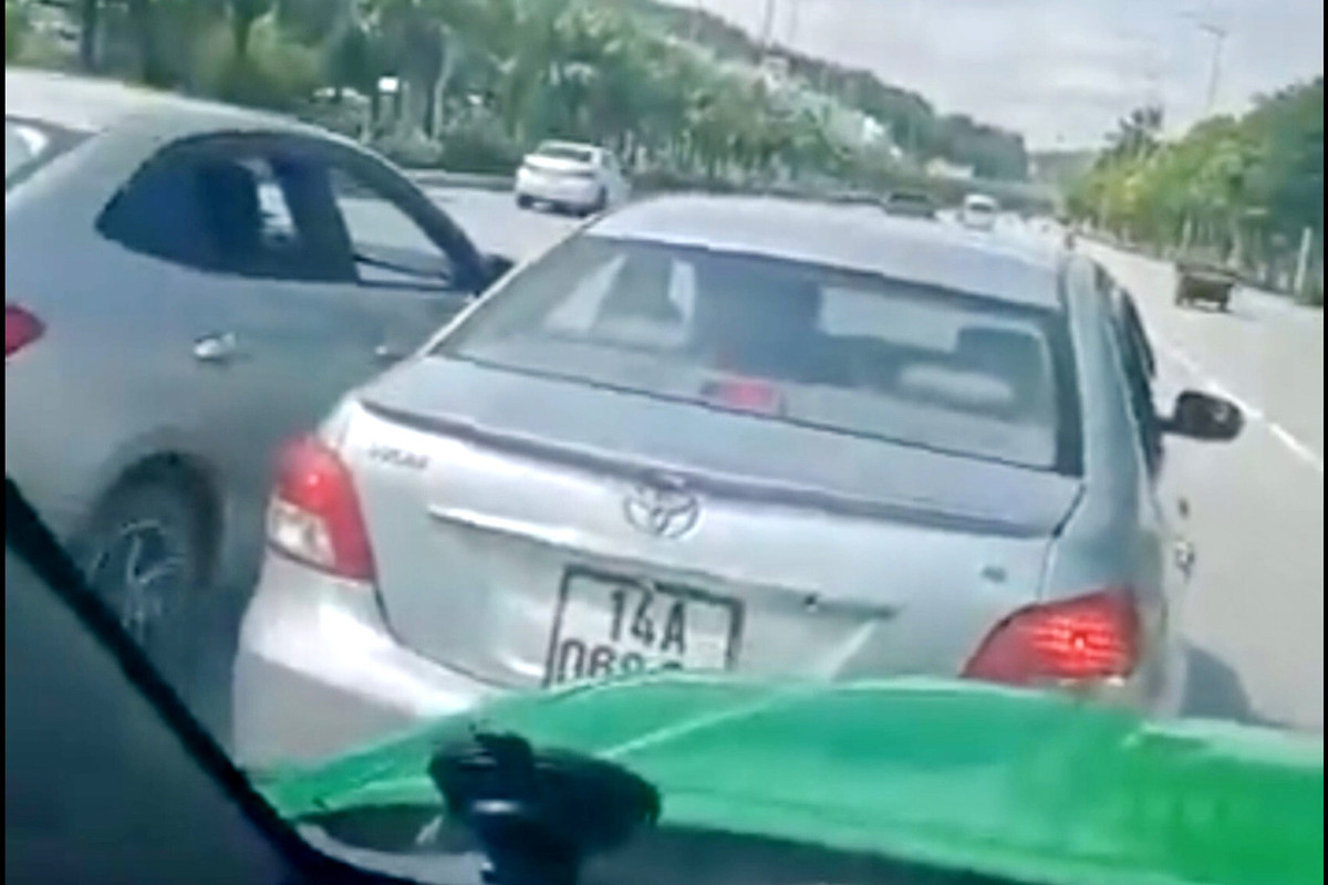 Sau đó, 3 ô tô này tiếp tục di chuyển chậm, liên tục đổi làn đường để ngăn không cho taxi chở khách đi. Hai trong số 3 ô tô dàn hàng ngang mang biển kiểm soát 14A-068.62 và 14A-539.58.
