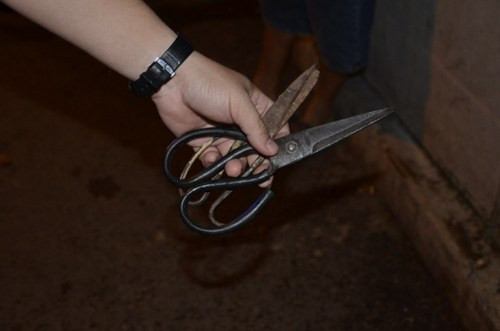 Cùng lúc, Kiệt rút cây kéo cắt tóc để trong túi quần ra đâm vào vai Tiến 3 nhát gây thương tích. Hùng thấy vậy bỏ chạy, sau đó quay lại đưa nạn nhân đi bệnh viện điều trị. Nhận tin báo, công an thị trấn Tân Trụ mời Kiệt về trụ sở làm việc, thu hồi cây kéo gây án.