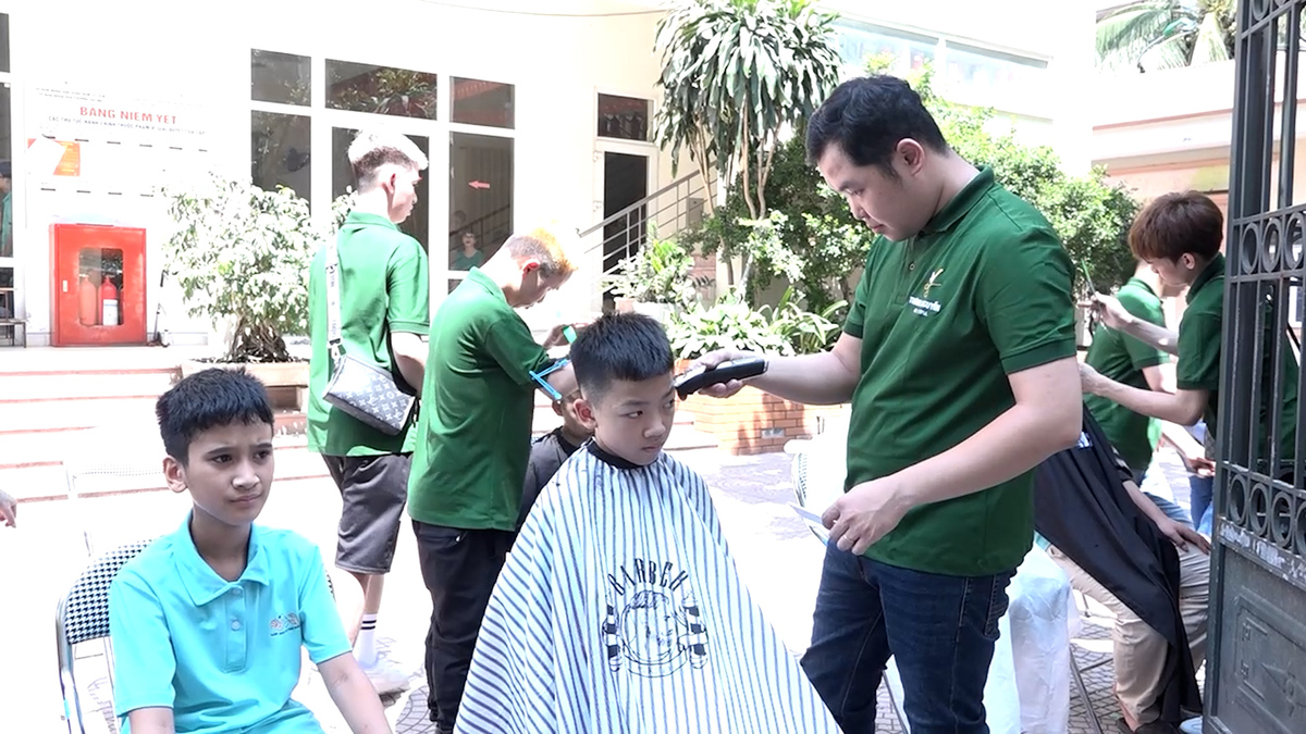 Anh Nguyễn Thái Thành (Bắc Giang) bị câm điếc bẩm sinh đã cùng nhóm bạn của mình, cắt tóc miễn phí cho trẻ khiếm thính tại Hà Nội dịp 1/6.