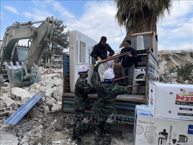 Các chiến sĩ lực lượng cứu hộ, cứu nạn của QĐND Việt Nam giúp đỡ người dân di chuyển đồ khỏi nơi đổ nát. (Ảnh: PV TTXVN từ Hatay, Thổ Nhĩ Kỳ)