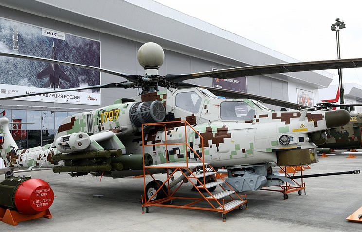 Mẫu Mi-28NE hiện đại hóa đang trược trưng bày tĩnh tại triển lãm của diễn đàn. “Thợ săn đêm” được trang bị tên lửa chống tăng Khrizantema và hệ thống hướng dẫn hai kênh. Các tên lửa có thể nâng tầm tấn công lên 10 km.