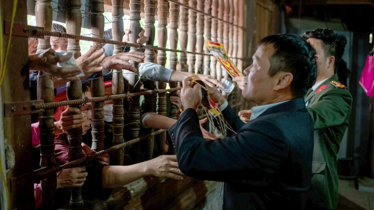 Thò tay qua khe cửa giành manh chiếu trong hội Đúc Bụt ở Vĩnh Phúc